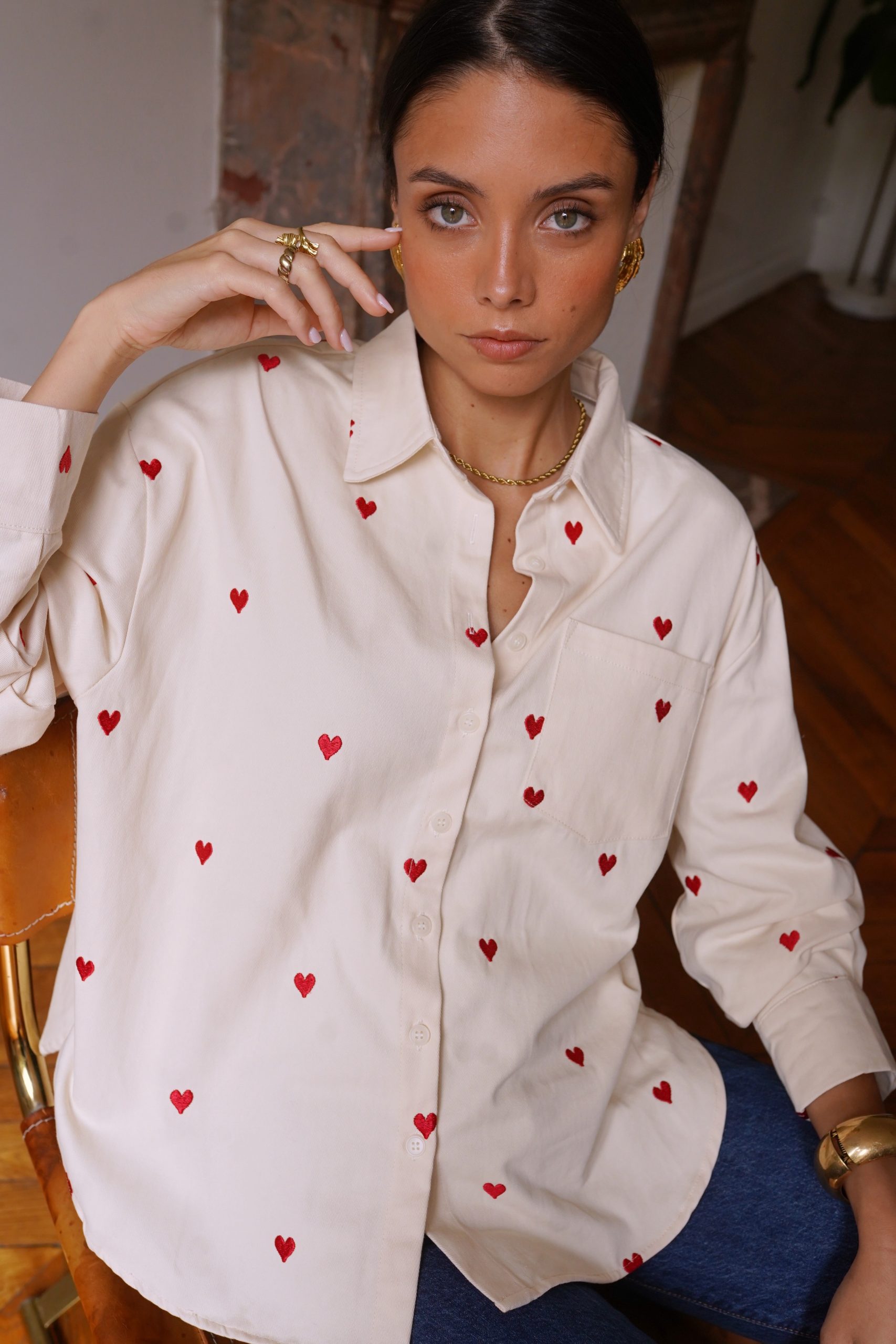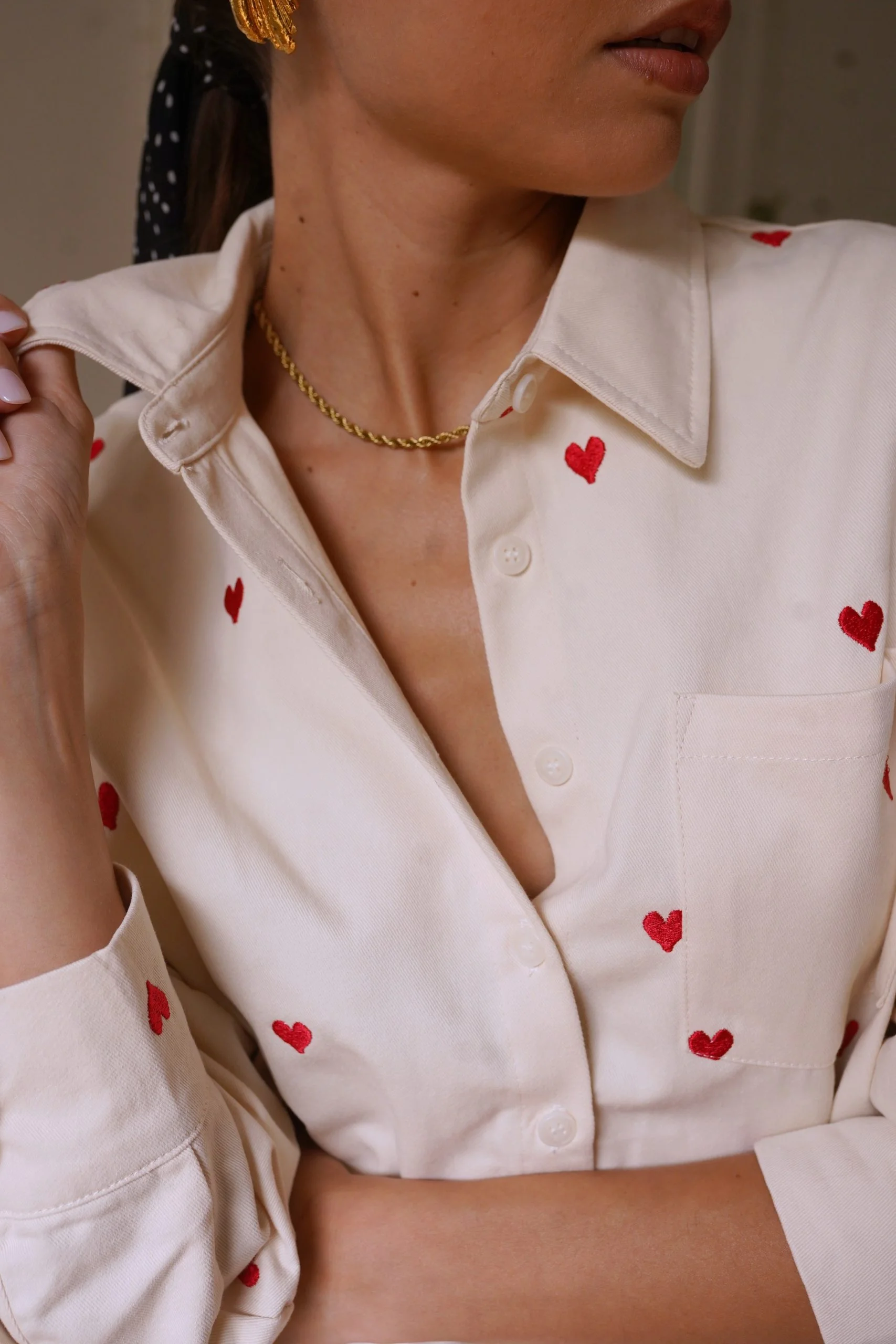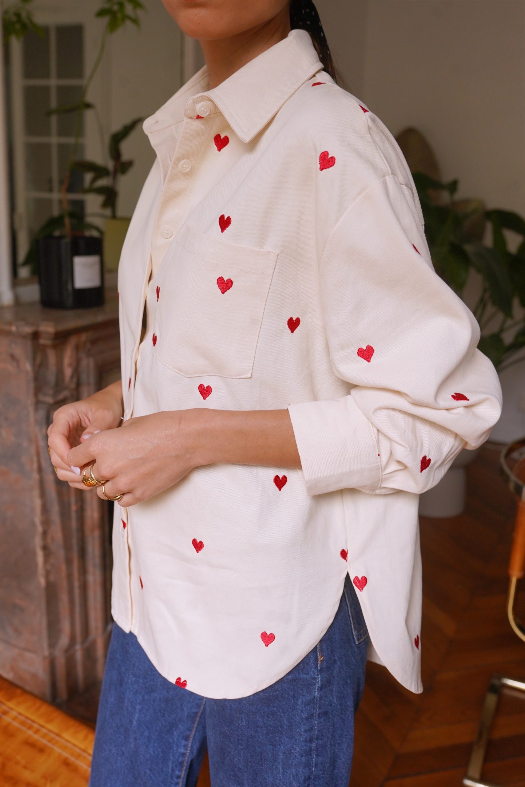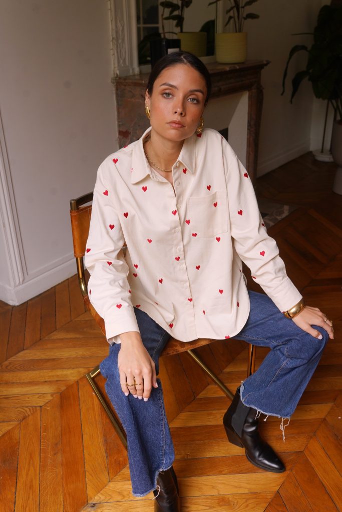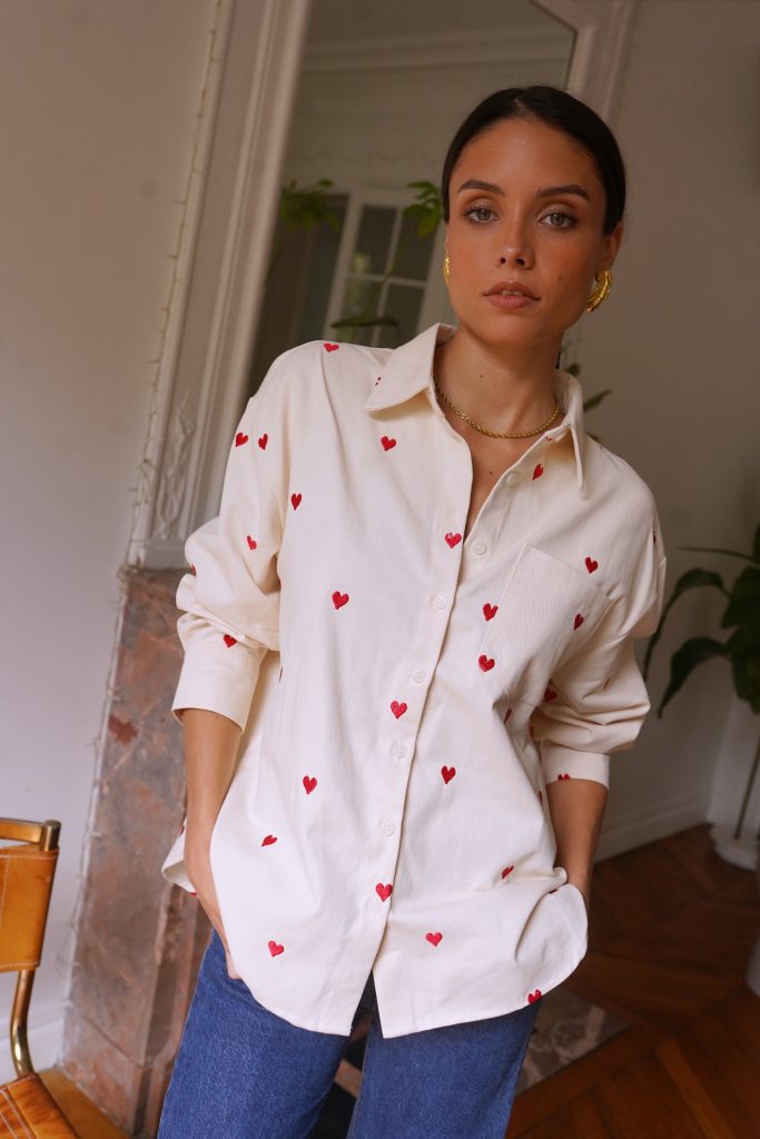 Αφήστε την καρδιά σας να μιλήσει με το πουκάμισό μας Anaé, ένα ανοιχτόχρωμο τζιν κομμάτι διακοσμημένο με μικρέ / ς κεντημένες κόκκινες καρδιές που προσθέτουν μια γλυκύτητα στην γκαρνταρόμπα σας. Κατασκευασμένο από ποιοτικό βαμβάκι, προσφέρει μια χαλαρή αλλά και θηλυκή εφαρμογή, ιδανικό για ηλιόλουστες μέρες ή βράδια με φίλους. Φορέστε το ελαφρώς ξεκούμπωτο για μια αβίαστα κομψή εμφάνιση ή δεμένο στη μέση για επιπλέον στυλ.