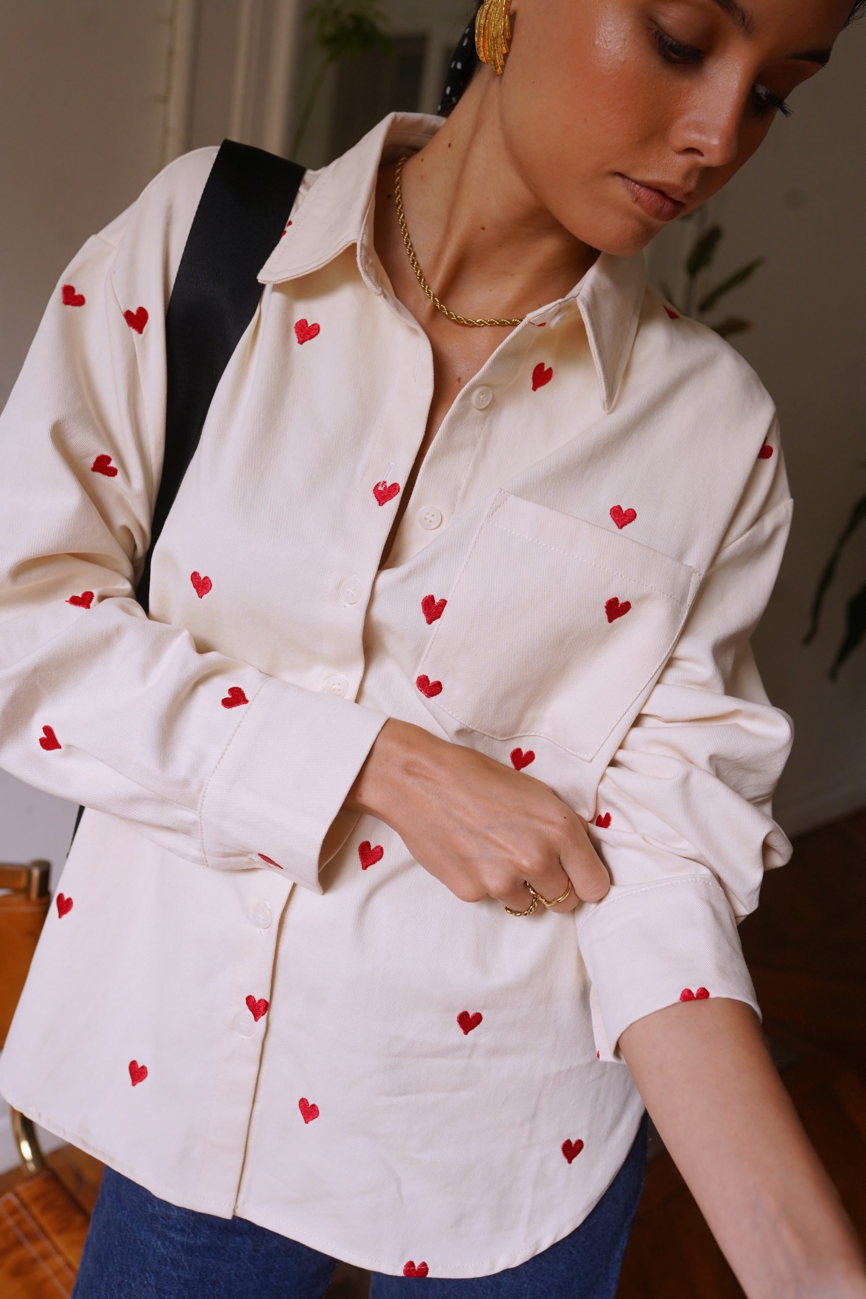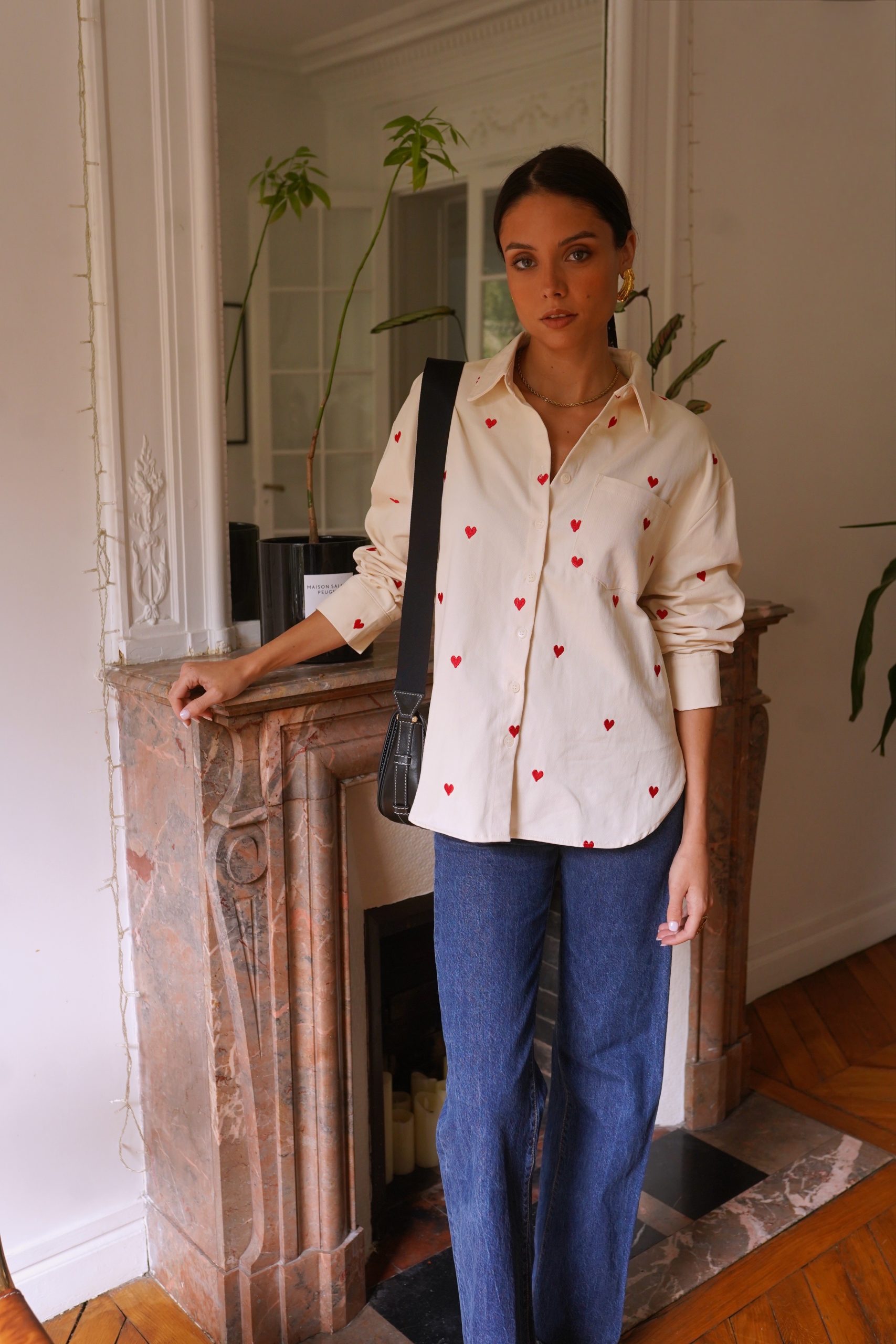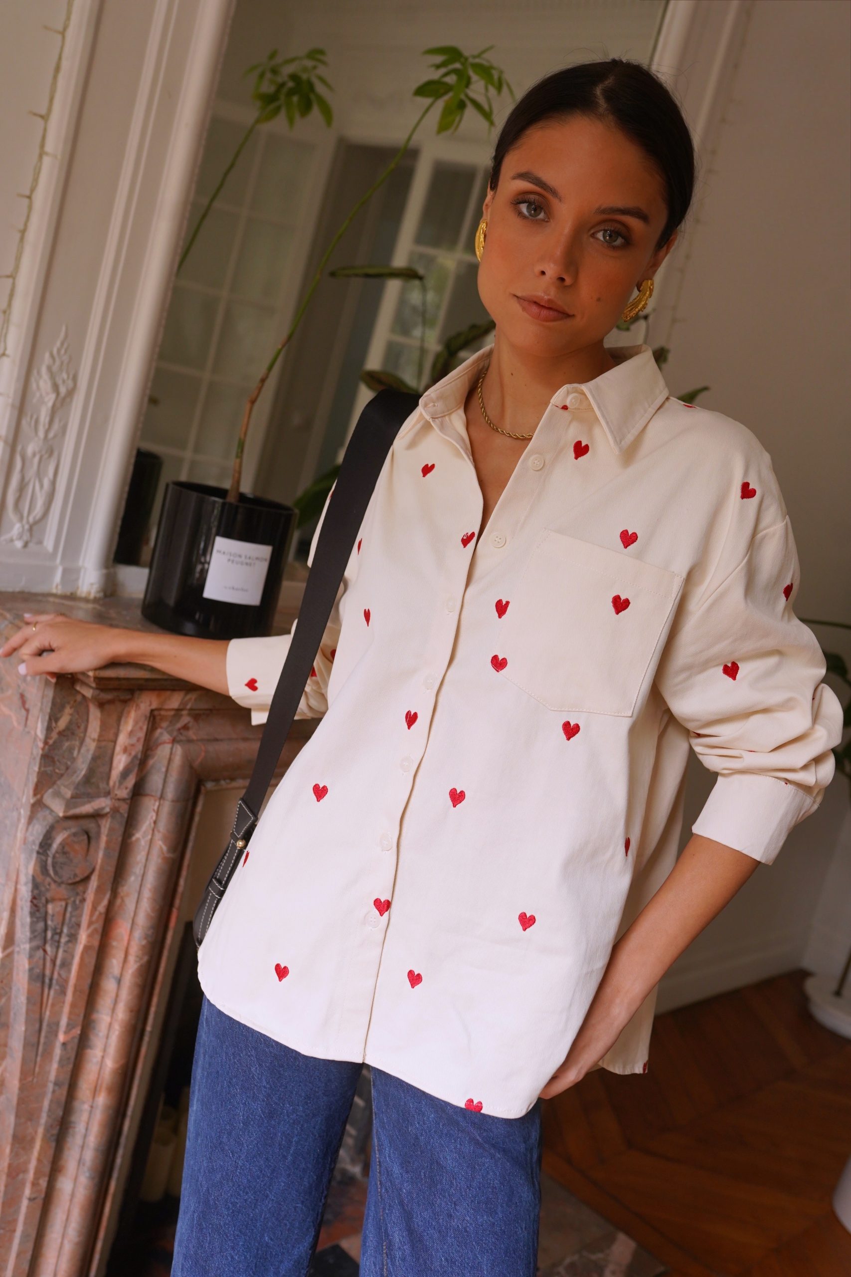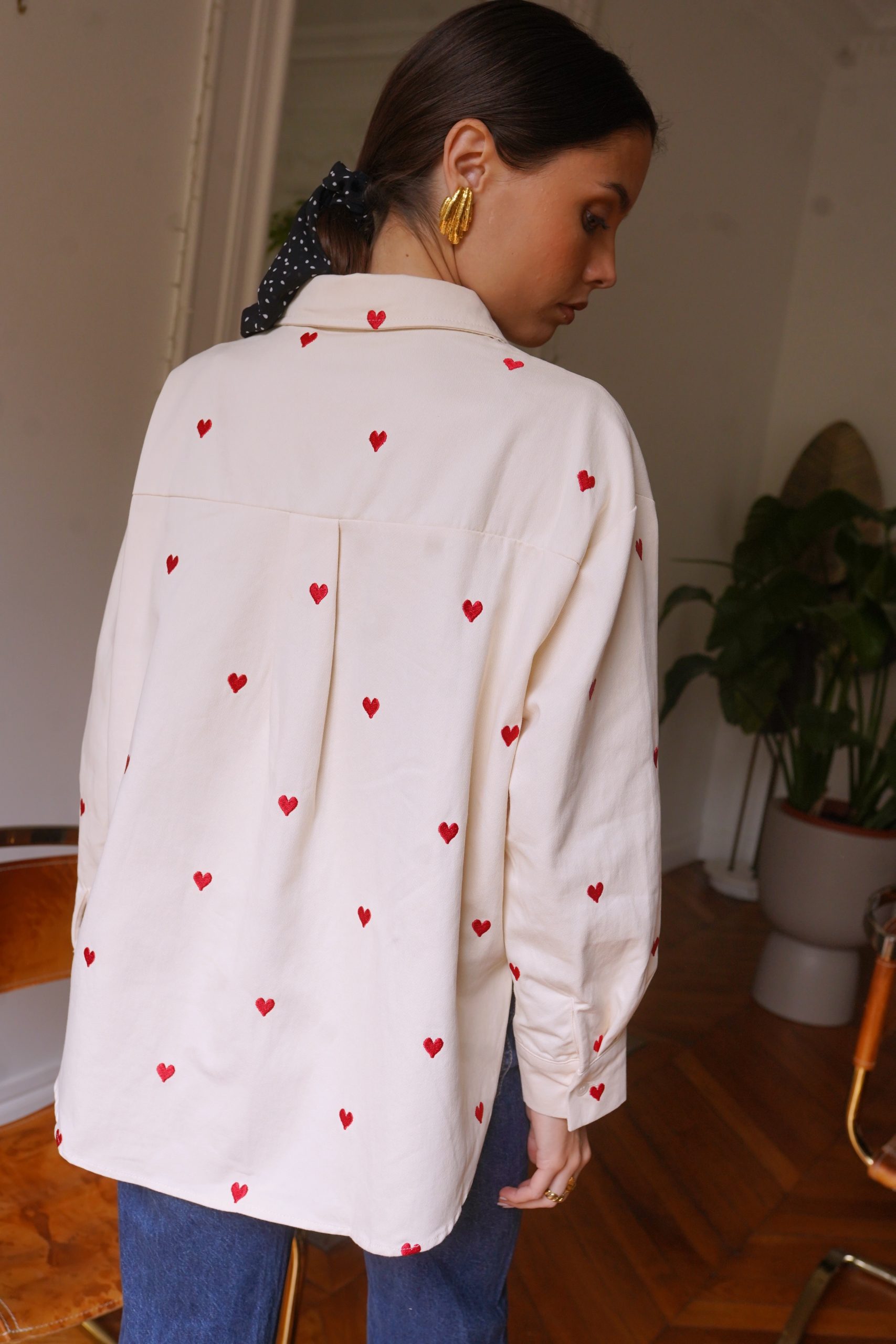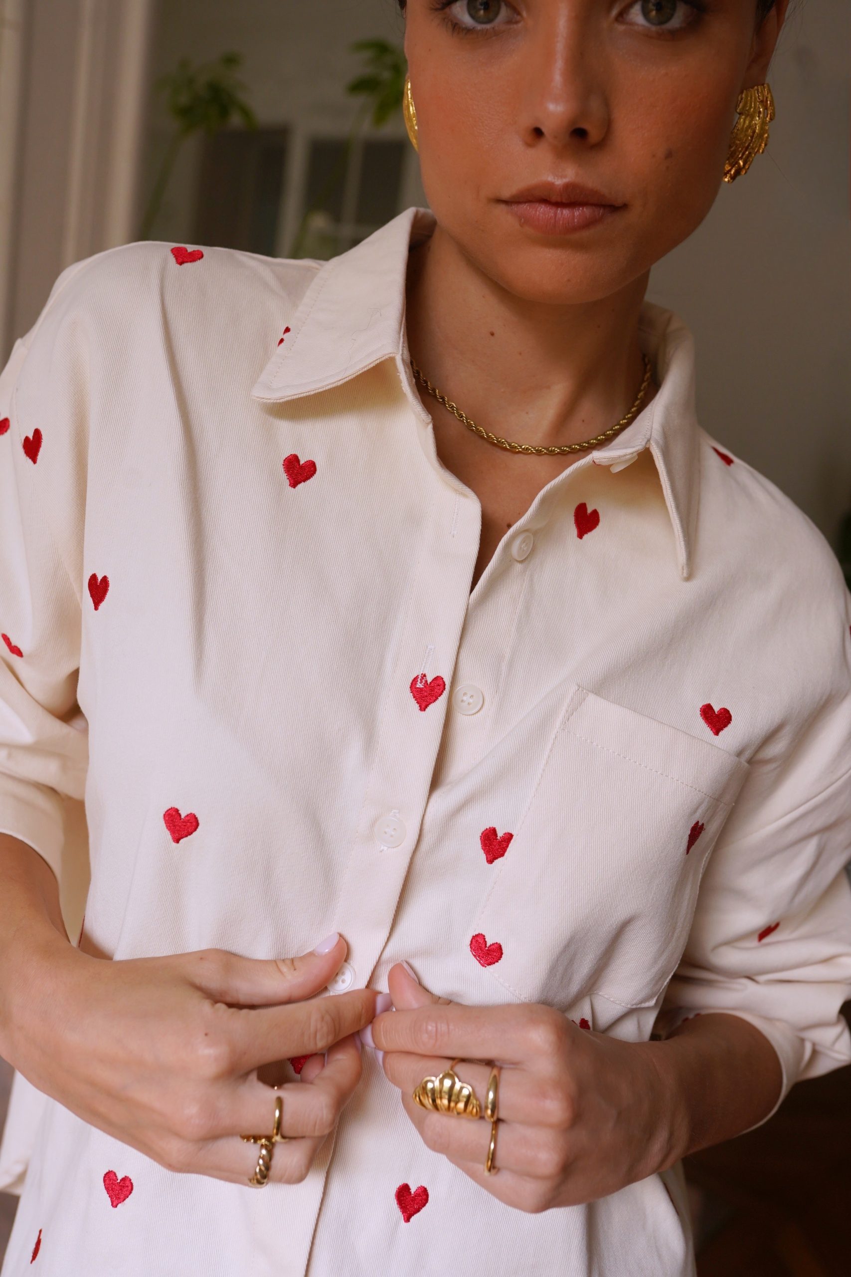 Αφήστε την καρδιά σας να μιλήσει με το πουκάμισό μας Anaé, ένα ανοιχτόχρωμο τζιν κομμάτι διακοσμημένο με μικρέ / ς κεντημένες κόκκινες καρδιές που προσθέτουν μια γλυκύτητα στην γκαρνταρόμπα σας. Κατασκευασμένο από ποιοτικό βαμβάκι, προσφέρει μια χαλαρή αλλά και θηλυκή εφαρμογή, ιδανικό για ηλιόλουστες μέρες ή βράδια με φίλους. Φορέστε το ελαφρώς ξεκούμπωτο για μια αβίαστα κομψή εμφάνιση ή δεμένο στη μέση για επιπλέον στυλ.